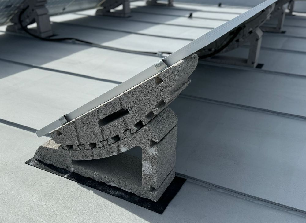 Nastavitelný betonový podstavec vyvinutý pro instalaci solárních panelů na rovné střechy a povrchy bez mechanického upevnění. Podpěry jsou vyrobené z vysoce pevného cementu a kameniva. Inovativní konstrukce umožňuje nastavení optimální výšky pro každé místo a dokonce ji měnit v závislosti na ročním období. Není třeba žádné upevnění ani šrouby do podložky, protože samotná hmotnost sestavy je schopna odolat silnému větru. Úhel uložení panelu je nastavitelný od 10° do 40° (fragment po 5°).
