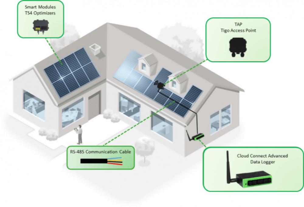 Gateway je nainstalován na střeše u panelů a přijímá zde data z nich v okruhu 15 m. Tato data zasílá prostřednictvím vedení RS485 do dataloggeru Cloud Connect Advanced a na portál Tigo. Tento set umožňuje prostřednictvím připojení snímače odpojení komunikace na úrovni panelu.